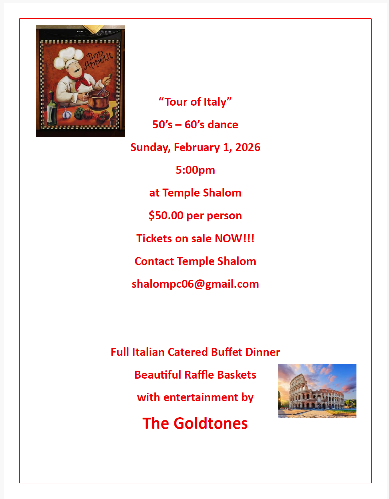 - "Tour of Italy" – February 1, 2026 – Italian Catered Buffet Dinner and entertainment by the Goldtones (see flyer below)